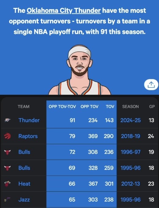恐怖雷霆季后賽失誤比對手少91個&暫列歷史第一!25都是冠軍