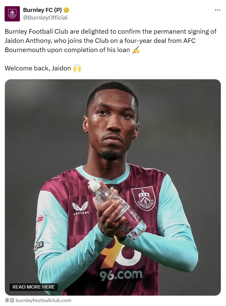 官方:伯恩利從伯恩茅斯直接買(mǎi)斷杰登安東尼,雙方合同期為四年