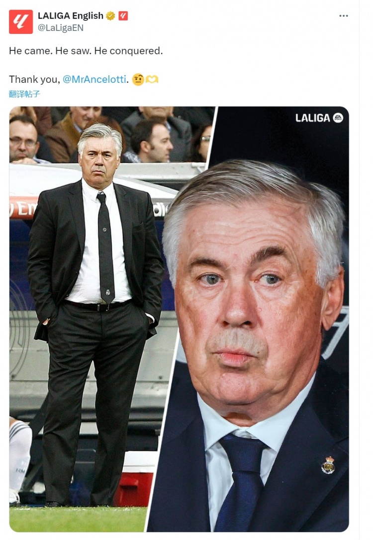 西甲官方社媒曬照致敬安切洛蒂:他來,他見,他征服